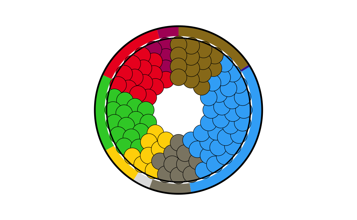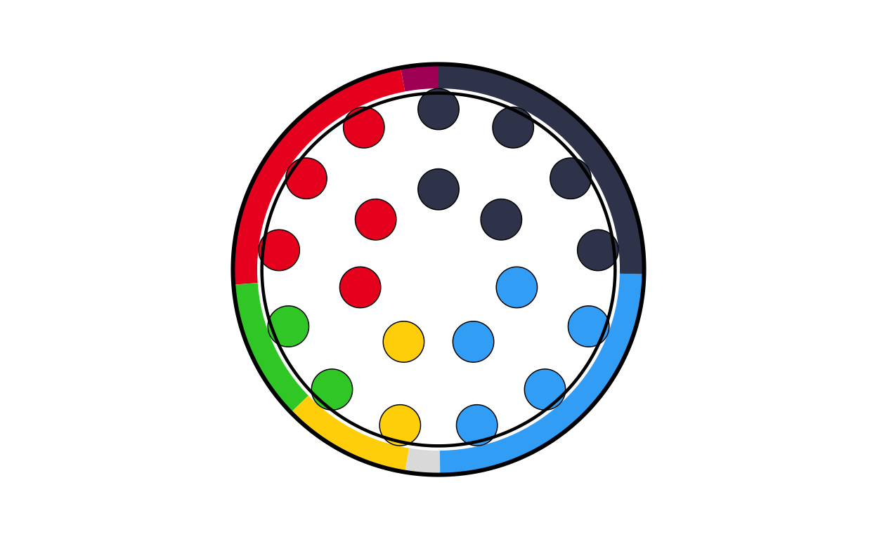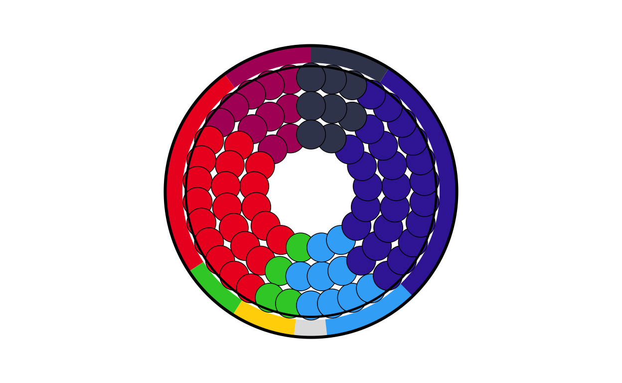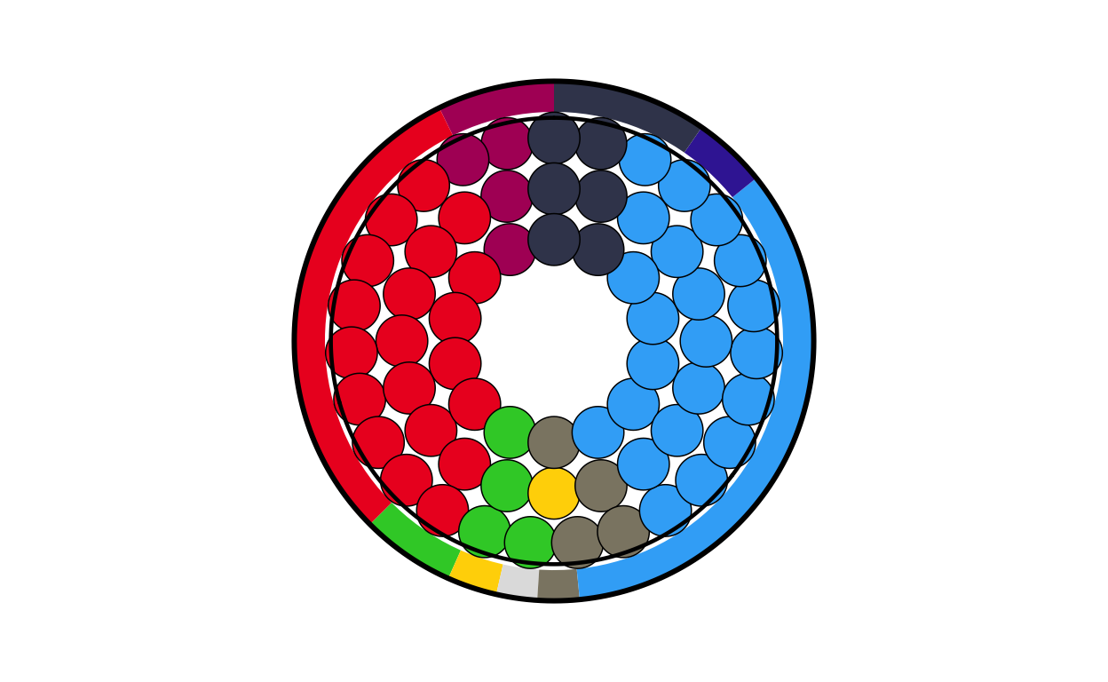 Parliament plots (also called hemicycle diagrams) are used to represent the seat distribution in legislative bodies. Traditionally, dots are arranged in a semicircle or horseshoe shape where each dot represents one seat/ representative and the colour of the dot represents the political party or group that the representative is affiliated with. In this case, the original plot uses 27 distinct, circular parliament plots to visualise the seat breakdown by European Parliament group in each of the EU member states.