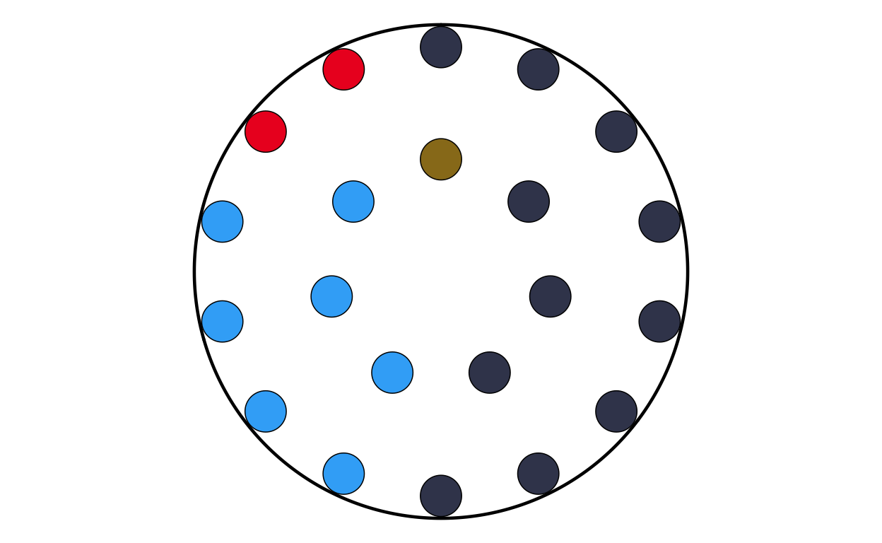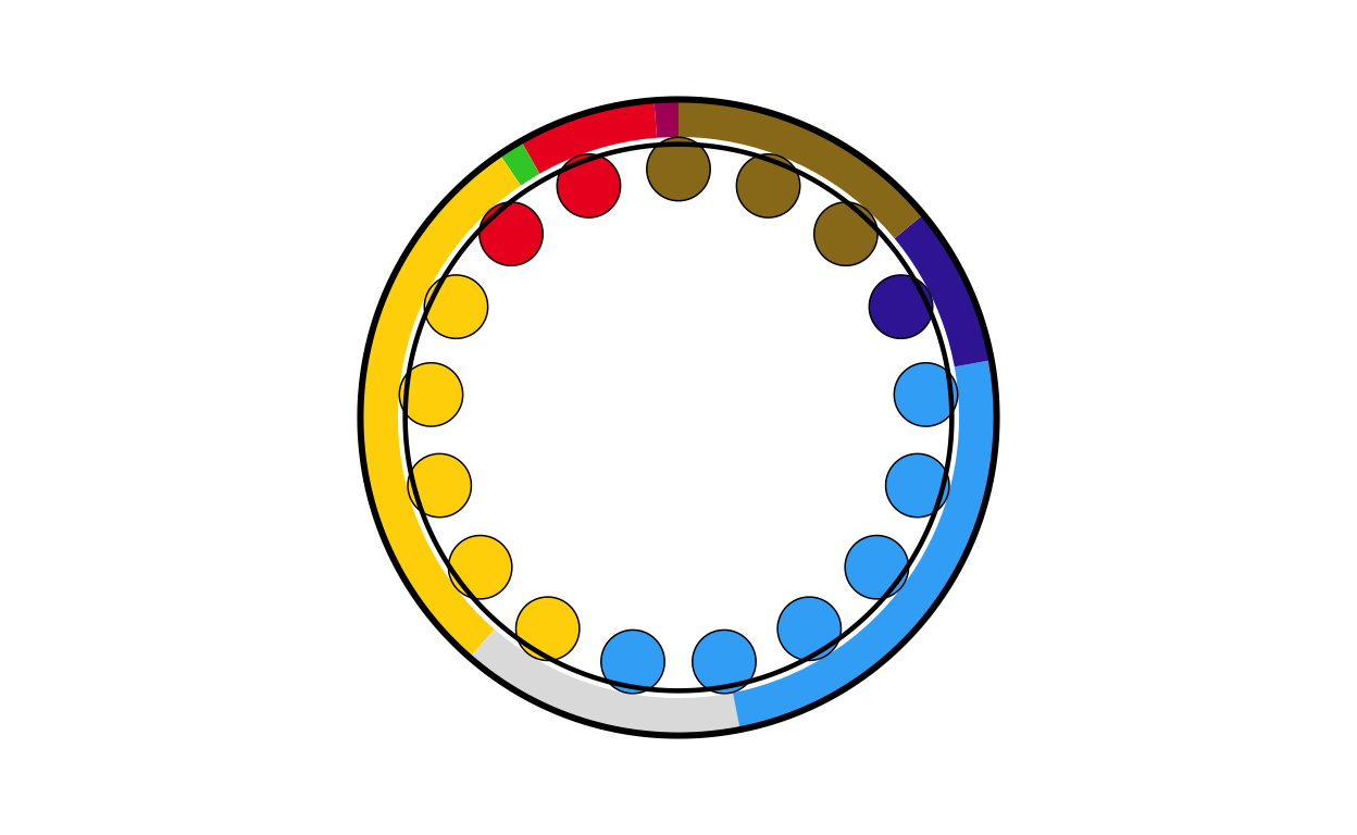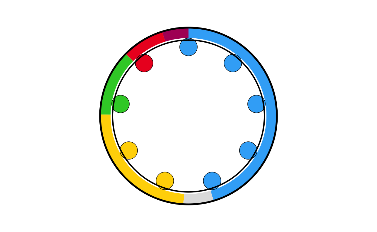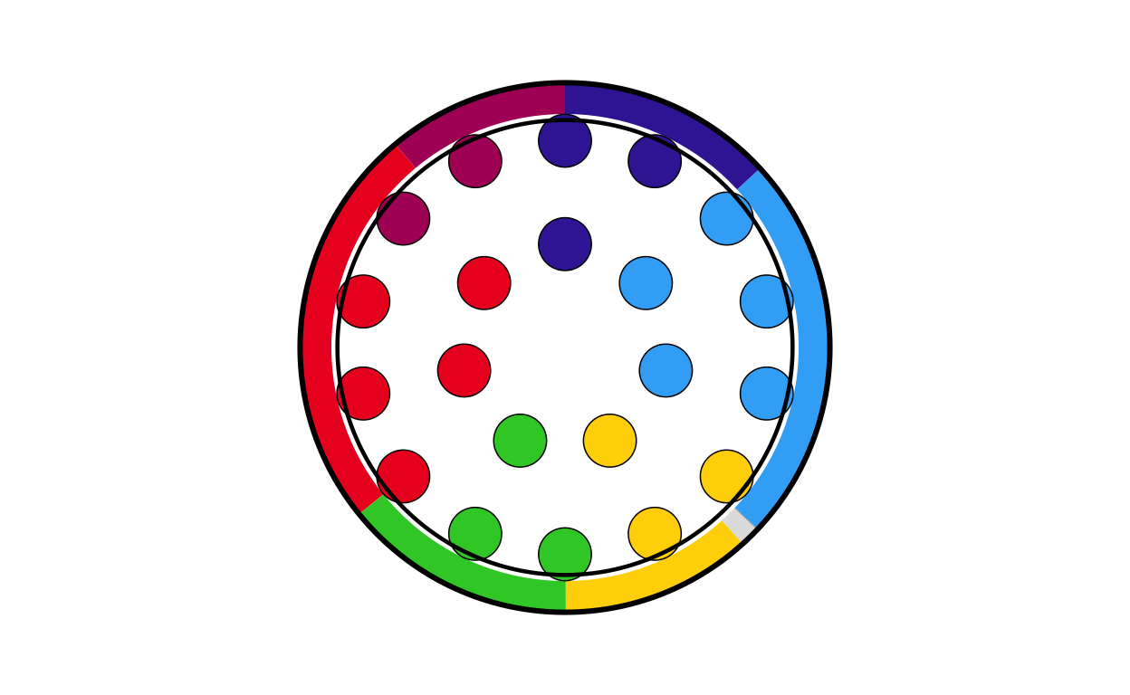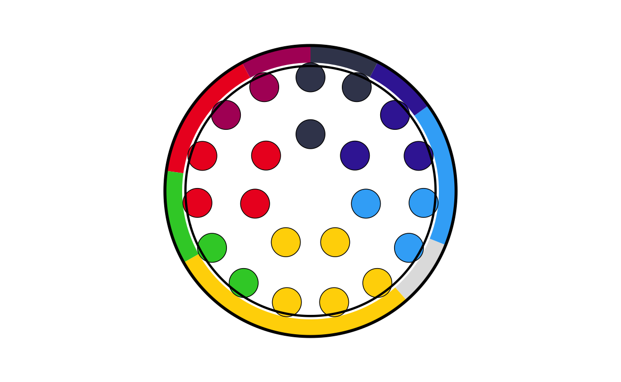 Parliament plots (also called hemicycle diagrams) are used to represent the seat distribution in legislative bodies. Traditionally, dots are arranged in a semicircle or horseshoe shape where each dot represents one seat/ representative and the colour of the dot represents the political party or group that the representative is affiliated with. In this case, the original plot uses 27 distinct, circular parliament plots to visualise the seat breakdown by European Parliament group in each of the EU member states.