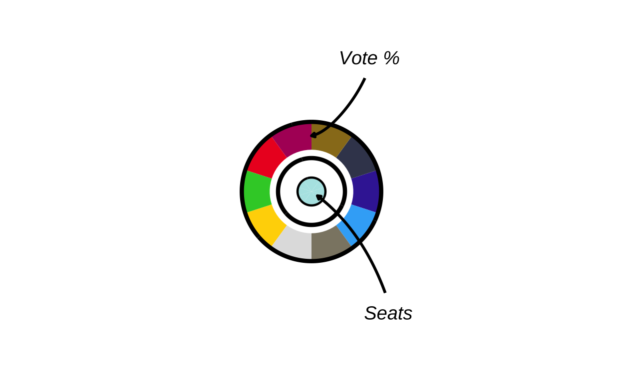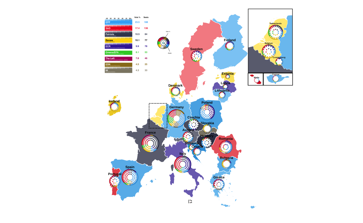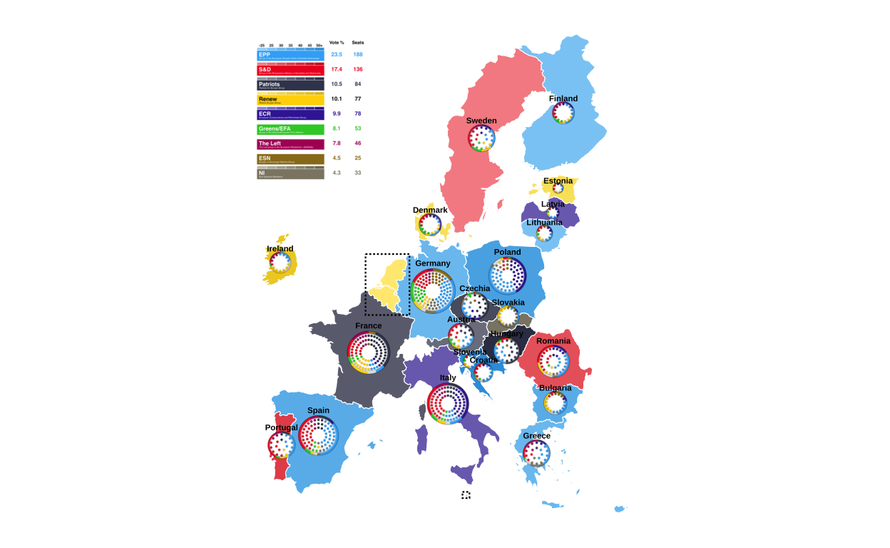 This plot aims to communicate the results of the elections to a wide audience by providing a unified visual overview at both a national and EU level. It does this by including geographic, seat-based, and vote-proportion representations.