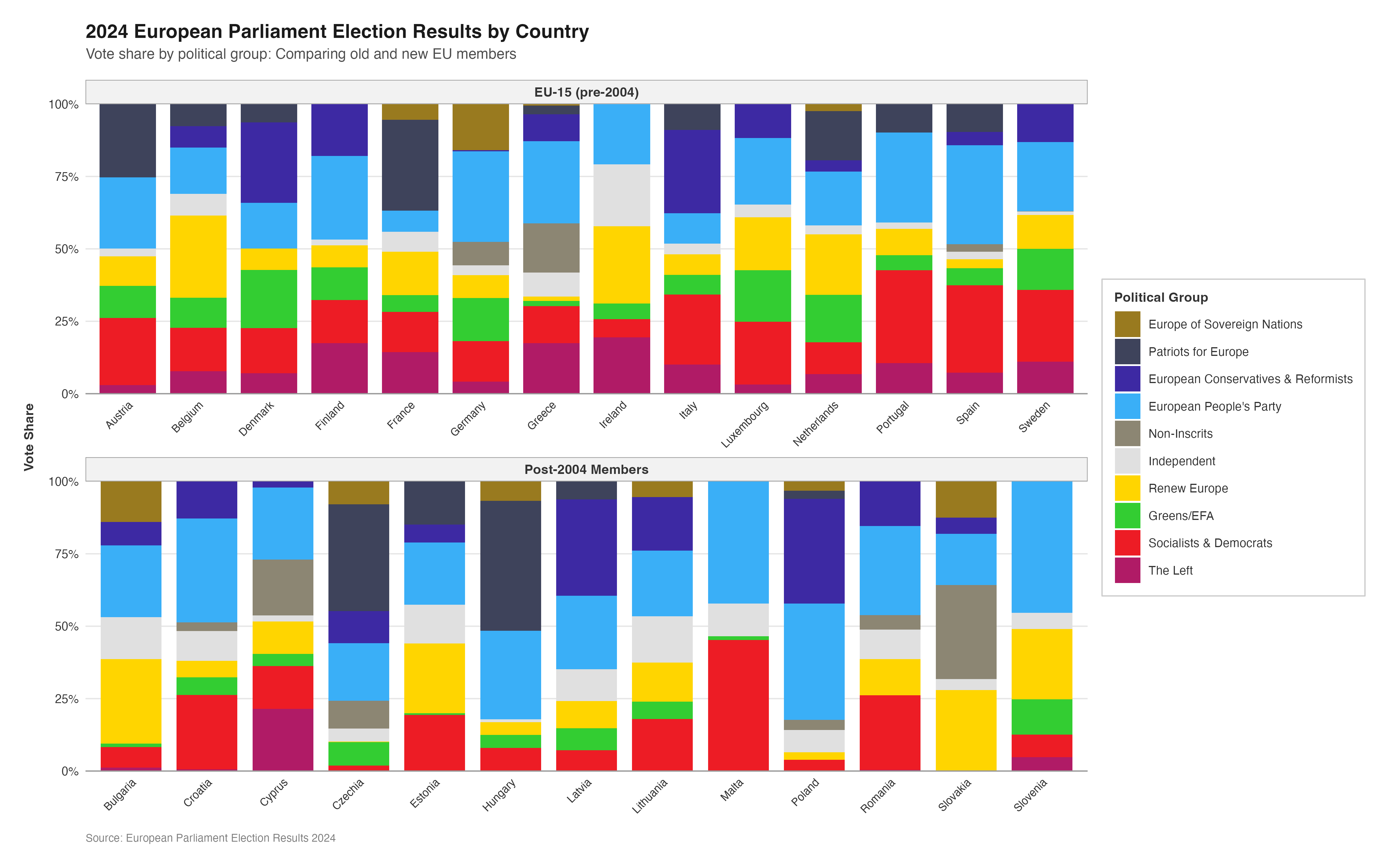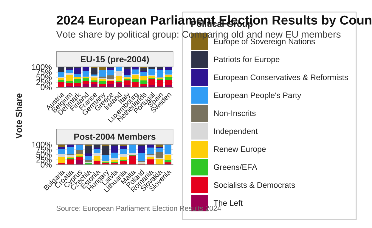 subtitle = "Vote share by political group: Comparing old and new EU members",