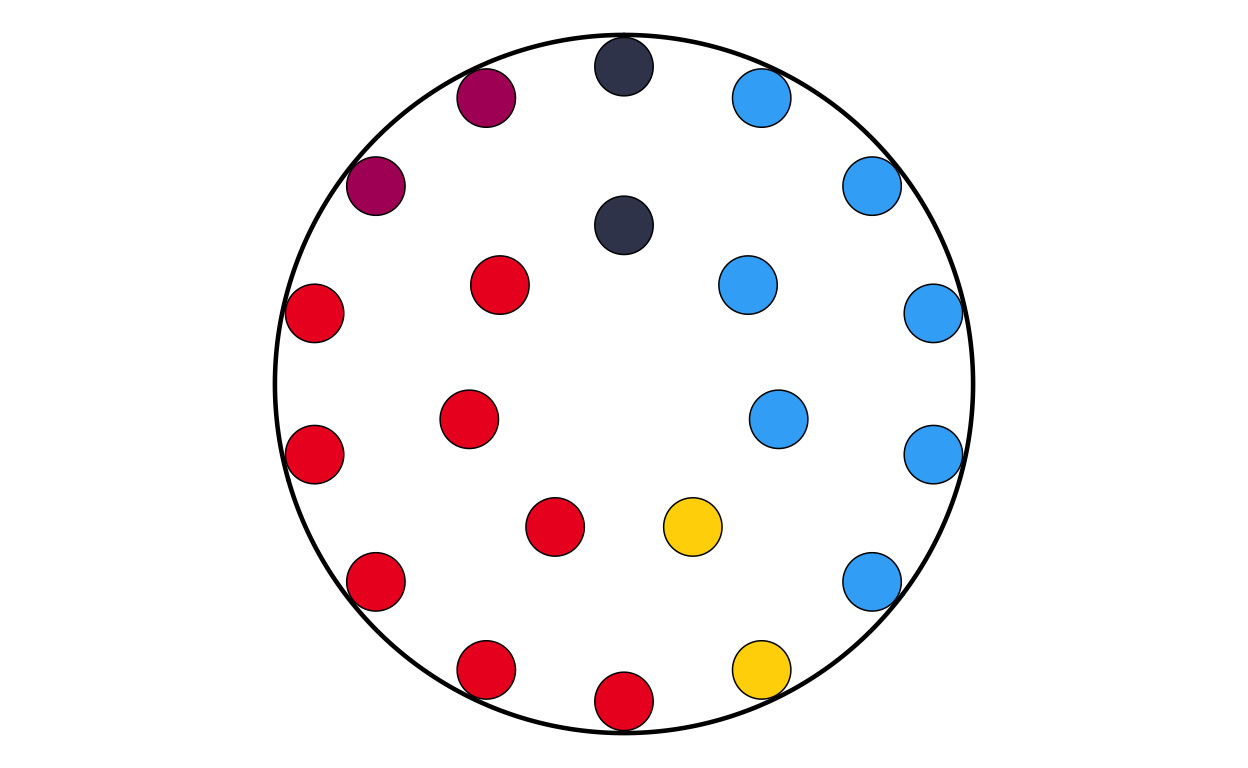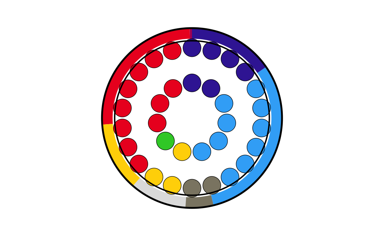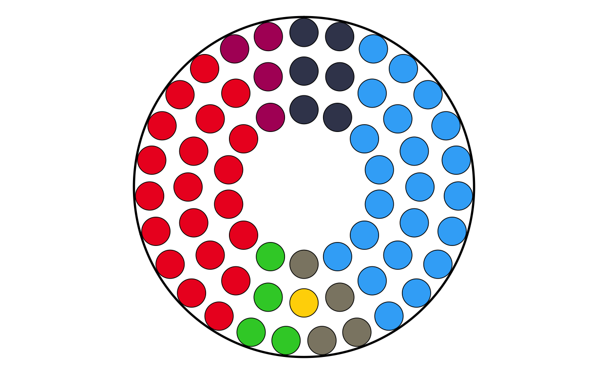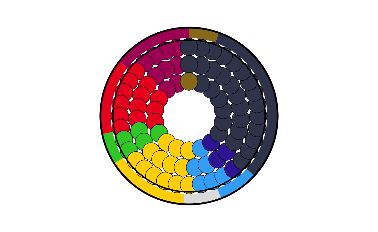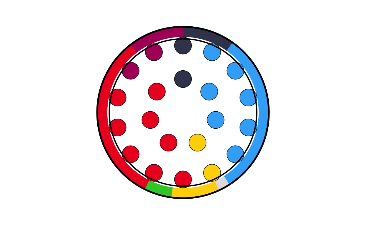 Parliament plots (also called hemicycle diagrams) are used to represent the seat distribution in legislative bodies. Traditionally, dots are arranged in a semicircle or horseshoe shape where each dot represents one seat/ representative and the colour of the dot represents the political party or group that the representative is affiliated with. In this case, the original plot uses 27 distinct, circular parliament plots to visualise the seat breakdown by European Parliament group in each of the EU member states.
