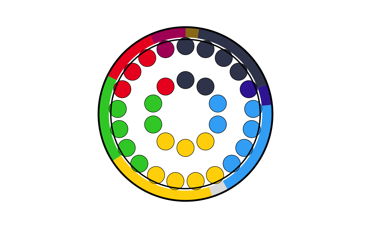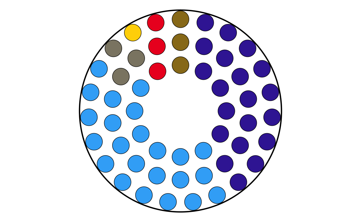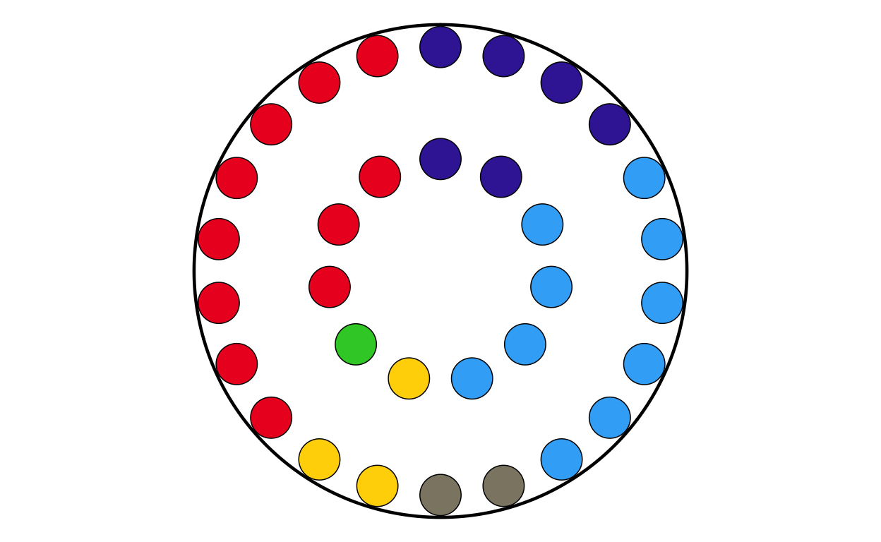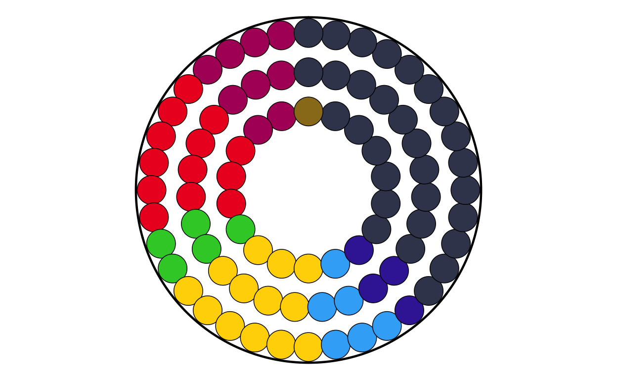 Parliament plots (also called hemicycle diagrams) are used to represent the seat distribution in legislative bodies. Traditionally, dots are arranged in a semicircle or horseshoe shape where each dot represents one seat/ representative and the colour of the dot represents the political party or group that the representative is affiliated with. In this case, the original plot uses 27 distinct, circular parliament plots to visualise the seat breakdown by European Parliament group in each of the EU member states.