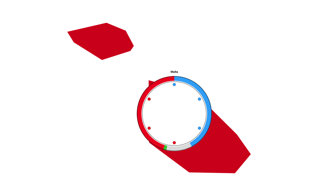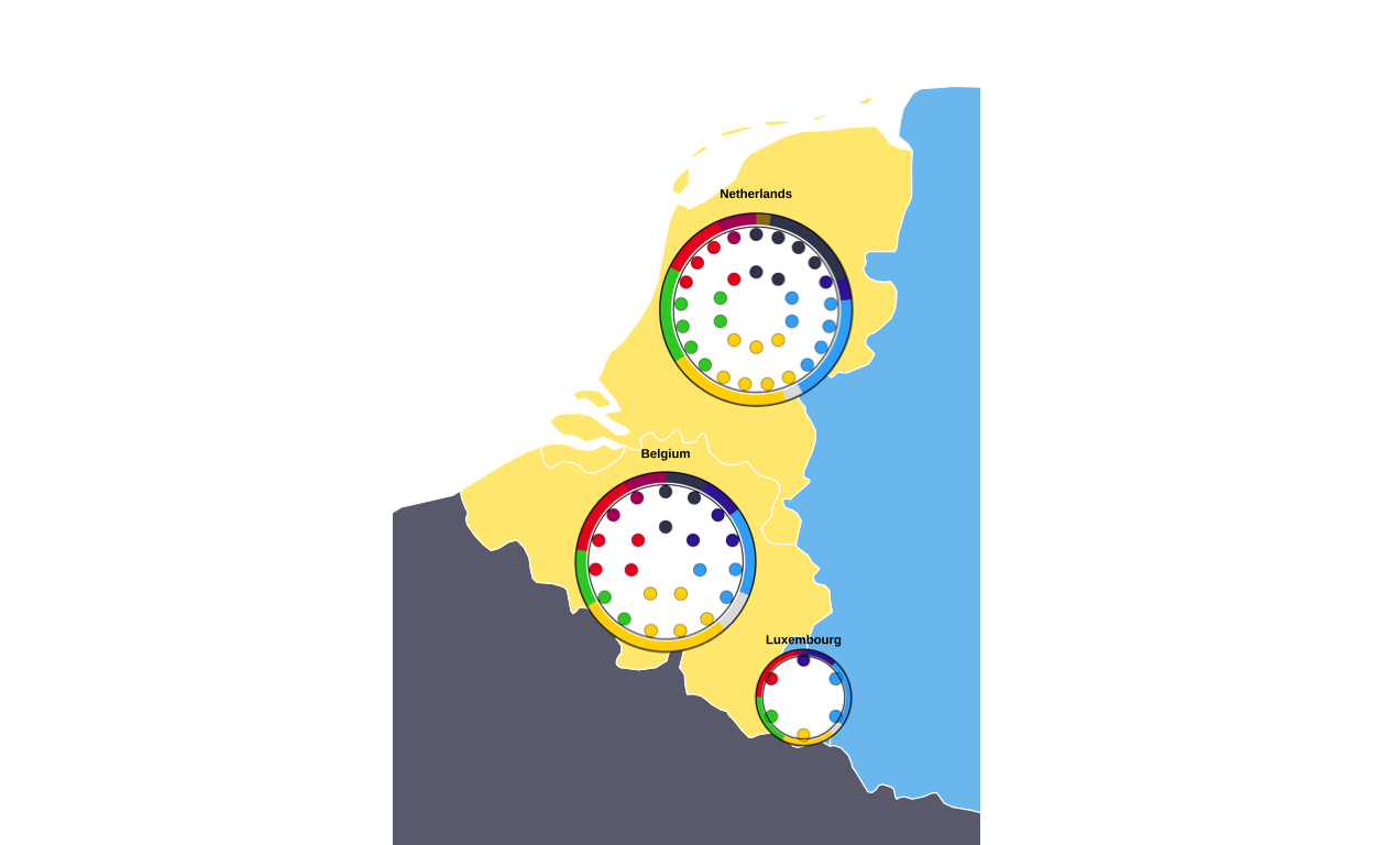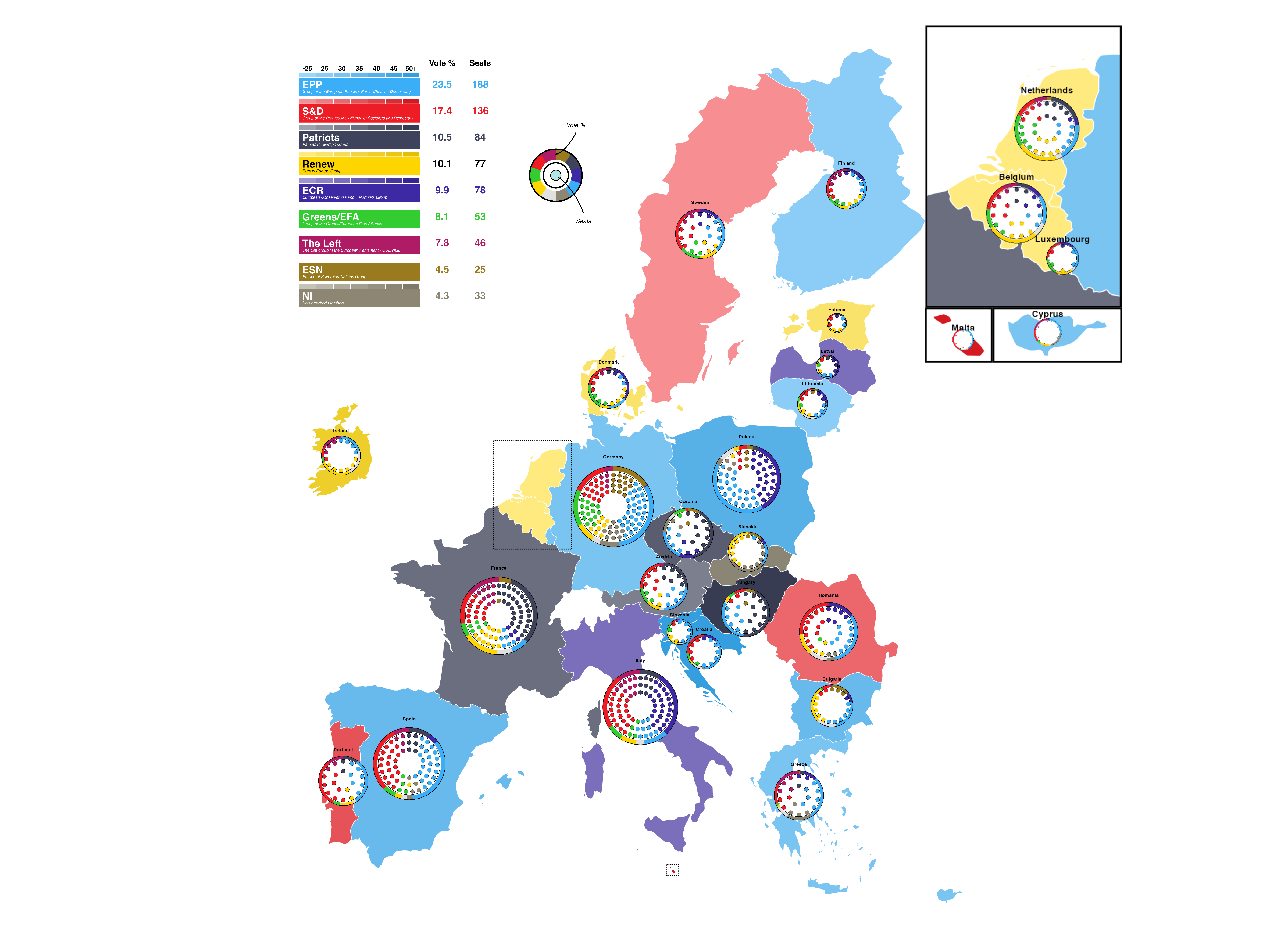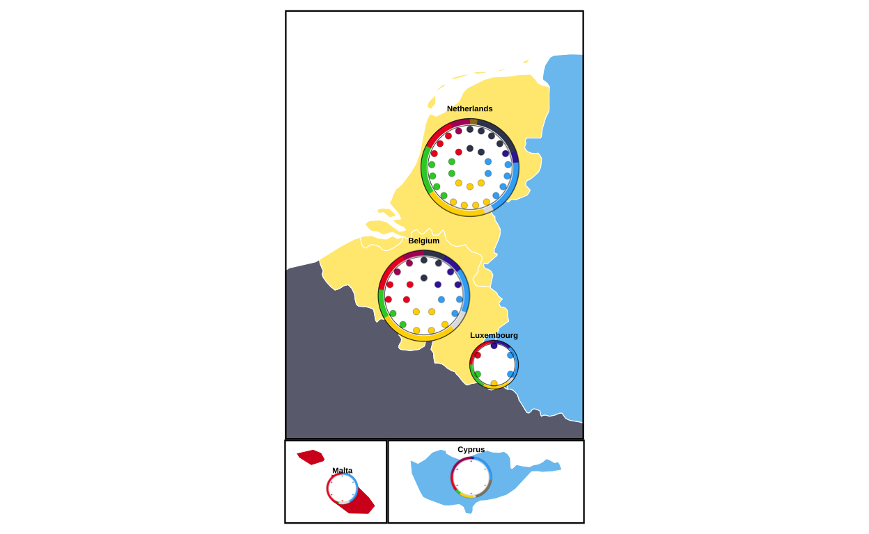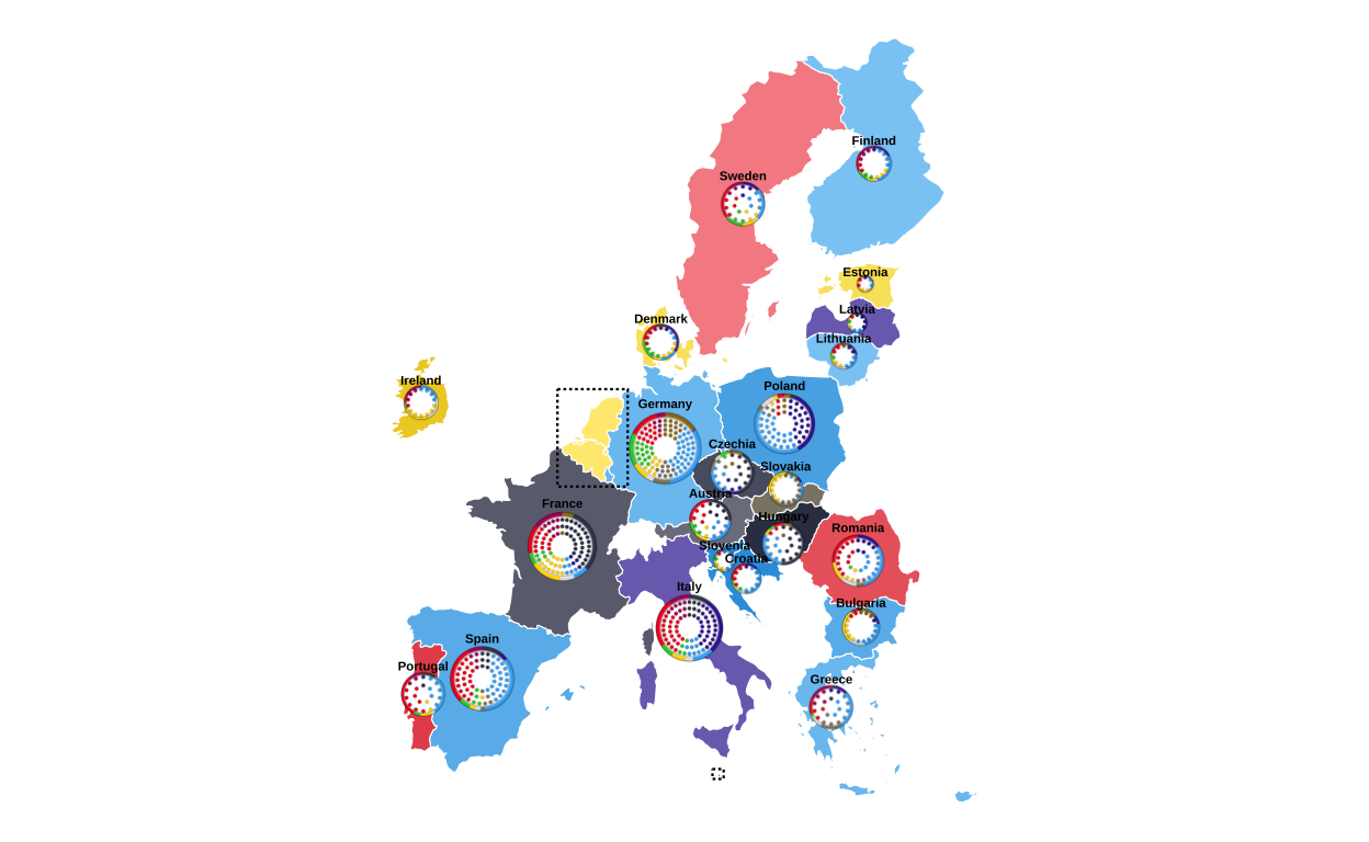This plot aims to communicate the results of the elections to a wide audience by providing a unified visual overview at both a national and EU level. It does this by including geographic, seat-based, and vote-proportion representations.