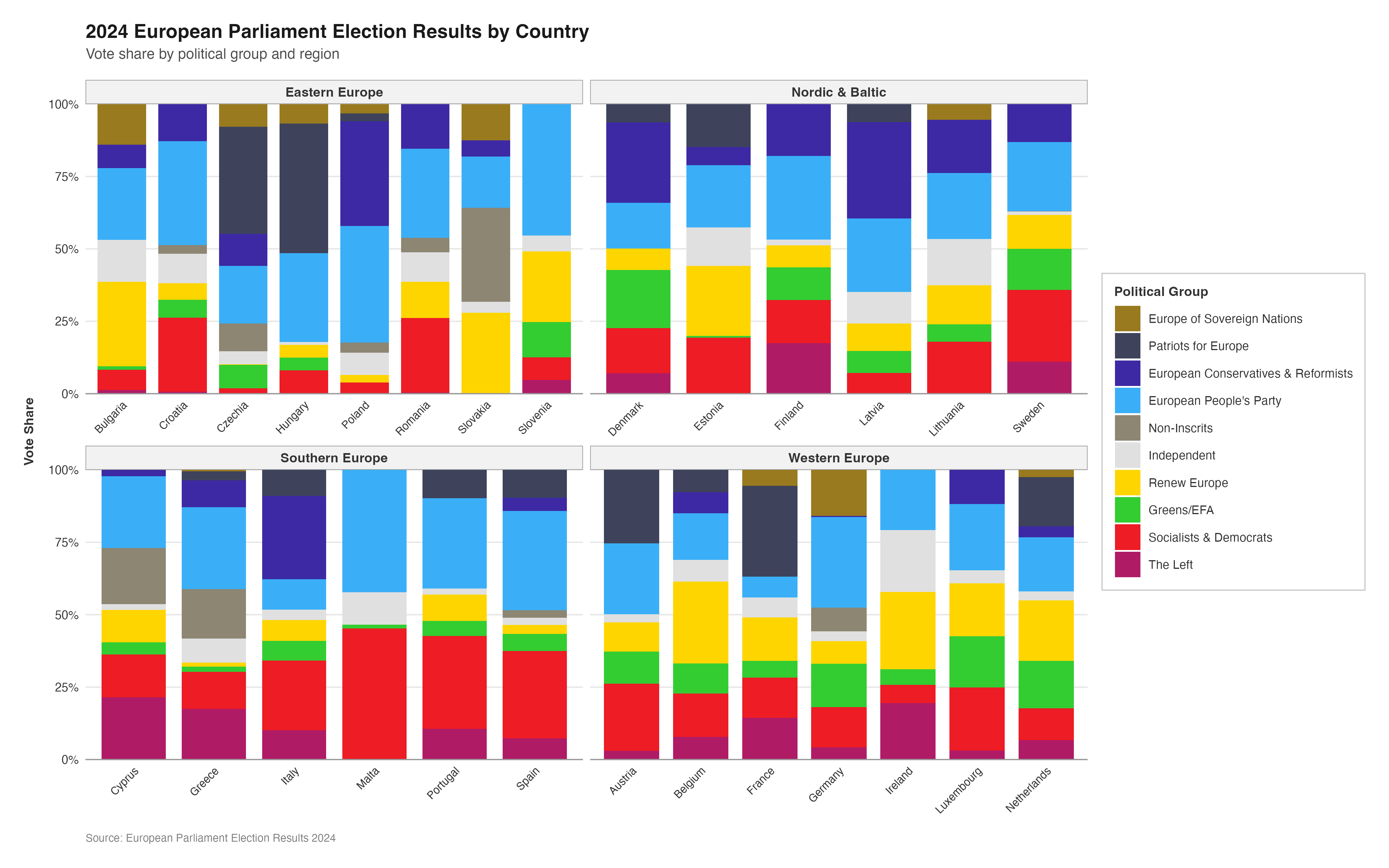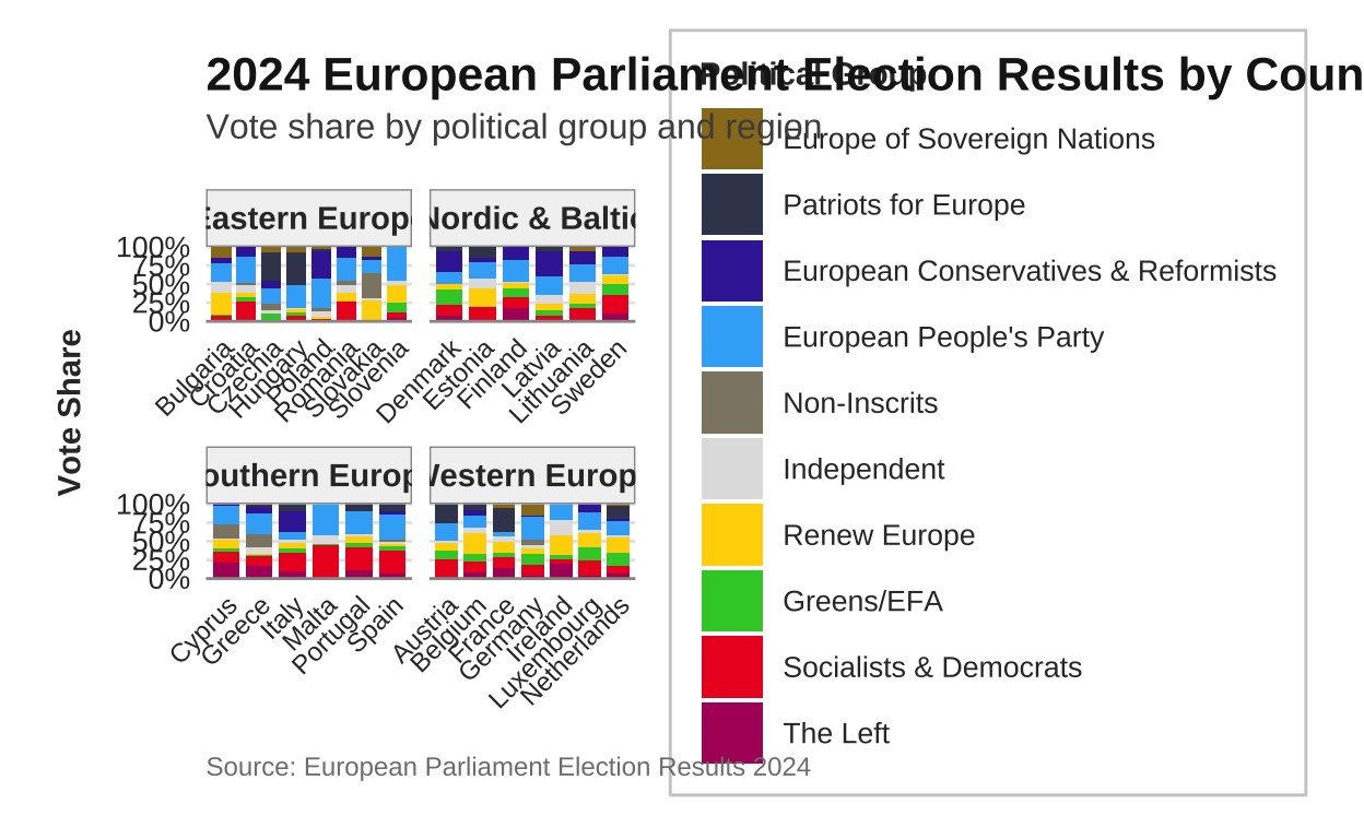 subtitle = "Vote share for each political group across EU member states",