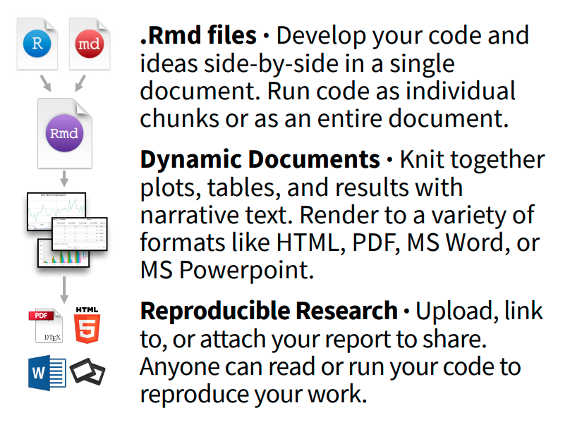 ] --- class: base24, middle, clear - [Version Control](ch4_1.html#3) - [R Markdown](ch4_2.html#3) --- class: inverse, center, middle # R Markdown ## The source code for documents --- class: base24 # Introduction <div style="float:right; width:25%"> <img src="ch4_files/figure-html/smcr-1.png" style="display: block; margin: auto;" /> </div> ## Goals -- - How to _communicate_ data with a visualization, i.e. how to effectively _encode_ a visual .blue[**message**], was covered in chapter 1. -- - Here, we refer to the .red[**channel**] used to _share_ that message. -- - We will talk about - Document formats (e.g.: article, report, book, presentation, website...) - File formats (e.g.: HTML, PDF, EPUB, DOCX, PPTX...) - **Reproducibility** (and automation) --- class: base24 # Introduction ## Markup language .pull-left[ - "a **text-encoding system** consisting of a set of symbols inserted in a text document to control its **structure**, formatting, or the relationship between its parts." - "Markup is often used to control the **display** of the document or to enrich its content to facilitating **automated processing**." ] .pull-right[ ```html <!DOCTYPE html> <html> <body> <h2>My First Heading</h2> <p>My first <b>paragraph</b></p> <a href="#">This is a link</a> </body> </html> ``` <h2>My First Heading</h2> <p>My first <b>paragraph</b>.</p> <a href="#">This is a link</a> ] --- class: base24 # Introduction ## Markdown .pull-left[ - Gruber & Swartz, 2004 - A markup language<br>**appealing to human readers**. - Rise, divergence, then standardization in 2012. - Many flavors still today. - Key component: **pandoc**,<br>by John MacFarlane. ] .pull-right[ ```markdown ## My First Heading My first **paragraph**. [This is a link](#) ``` .footnote[[Markdown Basics](https://rmarkdown.rstudio.com/lesson-8.html), [Pandoc's Markdown](https://pandoc.org/MANUAL.html#pandocs-markdown)] ## My First Heading My first **paragraph**. [This is a link](#) ] --- class: base24 # Introduction ## YAML .pull-left[ - _YAML Ain't Markup Language_ - Human-readable data-serialization language - Configuration files, etc. - Here, **document metadata** ] .pull-right[ ```yaml title: "Title: it contains a colon" author: - Author One - Author Two keywords: [nothing, nothingness] abstract: | This is the abstract. It consists of two paragraphs. ``` ] .footnote[[YAML syntax](https://en.wikipedia.org/wiki/YAML#Syntax)] --- class: base24 # R Markdown .footnote[[Reference guide](https://www.rstudio.com/wp-content/uploads/2015/03/rmarkdown-reference.pdf), [Cheatsheet](https://github.com/rstudio/cheatsheets/raw/main/rmarkdown-2.0.pdf)] .pull-left[ - An (optional) YAML header surrounded by `---`s - Text mixed with simple text formatting in Markdown - **Executable code chunks** surrounded by ` ``` `s ] -- .pull-right[  ] -- .center[] --- class: base24 # R Markdown ## Showcase <div style="position:fixed; left:40%; width:86%"> <img src="assets/img/ch4/code-1-options.png"> </div> - [Code chunks](https://rmarkdown.rstudio.com/lesson-3.html) - Chunk options - Figure output - [Inline code](https://rmarkdown.rstudio.com/lesson-4.html) - [Code languages](https://rmarkdown.rstudio.com/lesson-5.html) - [Parameters](https://rmarkdown.rstudio.com/lesson-6.html) - [Tables](https://rmarkdown.rstudio.com/lesson-7.html) - [Output formats](https://rmarkdown.rstudio.com/lesson-9.html) --- class: base24 # Documents and Notebooks ## Showcase <div style="position:fixed; left:40%; width:86%"> <img src="assets/img/ch4/code-1-options.png"> </div> - [HTML document](https://bookdown.org/yihui/rmarkdown/html-document.html) - [Notebook](https://bookdown.org/yihui/rmarkdown/notebook.html) - [PDF document](https://bookdown.org/yihui/rmarkdown/pdf-document.html) - [Word document](https://bookdown.org/yihui/rmarkdown/word-document.html) - Raw markup --- class: base24 # Presentations ## Showcase <div style="position:fixed; left:40%; width:86%"> <img src="assets/img/ch4/code-1-options.png"> </div> - [ioslides](https://bookdown.org/yihui/rmarkdown/ioslides-presentation.html) - [slidy](https://bookdown.org/yihui/rmarkdown/slidy-presentation.html) - [Beamer (PDF)](https://bookdown.org/yihui/rmarkdown/beamer-presentation.html) - [PowerPoint](https://bookdown.org/yihui/rmarkdown/powerpoint-presentation.html) - [reveal.js](https://bookdown.org/yihui/rmarkdown/revealjs.html) - [xaringan](https://bookdown.org/yihui/rmarkdown/xaringan.html) --- class: base24 # Other Formats ## Showcase <div style="position:fixed; left:40%; width:86%"> <img src="assets/img/ch4/code-1-options.png"> </div> - [Tufte Handouts](https://bookdown.org/yihui/rmarkdown/tufte-handouts.html) - [Websites](https://bookdown.org/yihui/rmarkdown/websites.html) - [Books](https://bookdown.org/yihui/rmarkdown/books.html) - [Journals](https://bookdown.org/yihui/rmarkdown/journals.html) - [**Distill**](https://rstudio.github.io/distill/) --- class: base24 # HTML Widgets - The `htmlwidgets` package provides a framework for creating R bindings to create **web components**. - Charts, but also maps, diagrams, tables, forms... and even mini-apps. Basically, any HTML component with optional **JavaScript**. -- - You don't generally need to use the `htmlwidgets` package directly. Many packages use it to provide many components. -- - They can be - used at the R console for data analysis, just like conventional R plots; - embedded within any **HTML document**; - saved as standalone web pages for ad-hoc sharing. --- # HTML Widgets .pull-left-mod[ ``` r p <- ggplot(gapminder::gapminder) + aes(gdpPercap, lifeExp) + geom_point(aes(size=pop, color=continent), alpha=0.7) + scale_size(range=c(2, 12), guide=NULL) + scale_x_log10() + theme_gray(base_size=10) + aes(frame=year, text=country) library(plotly) ggplotly(p) |> layout(legend=list( x=1, y=0, xanchor="right")) ``` ] .pull-right-mod[